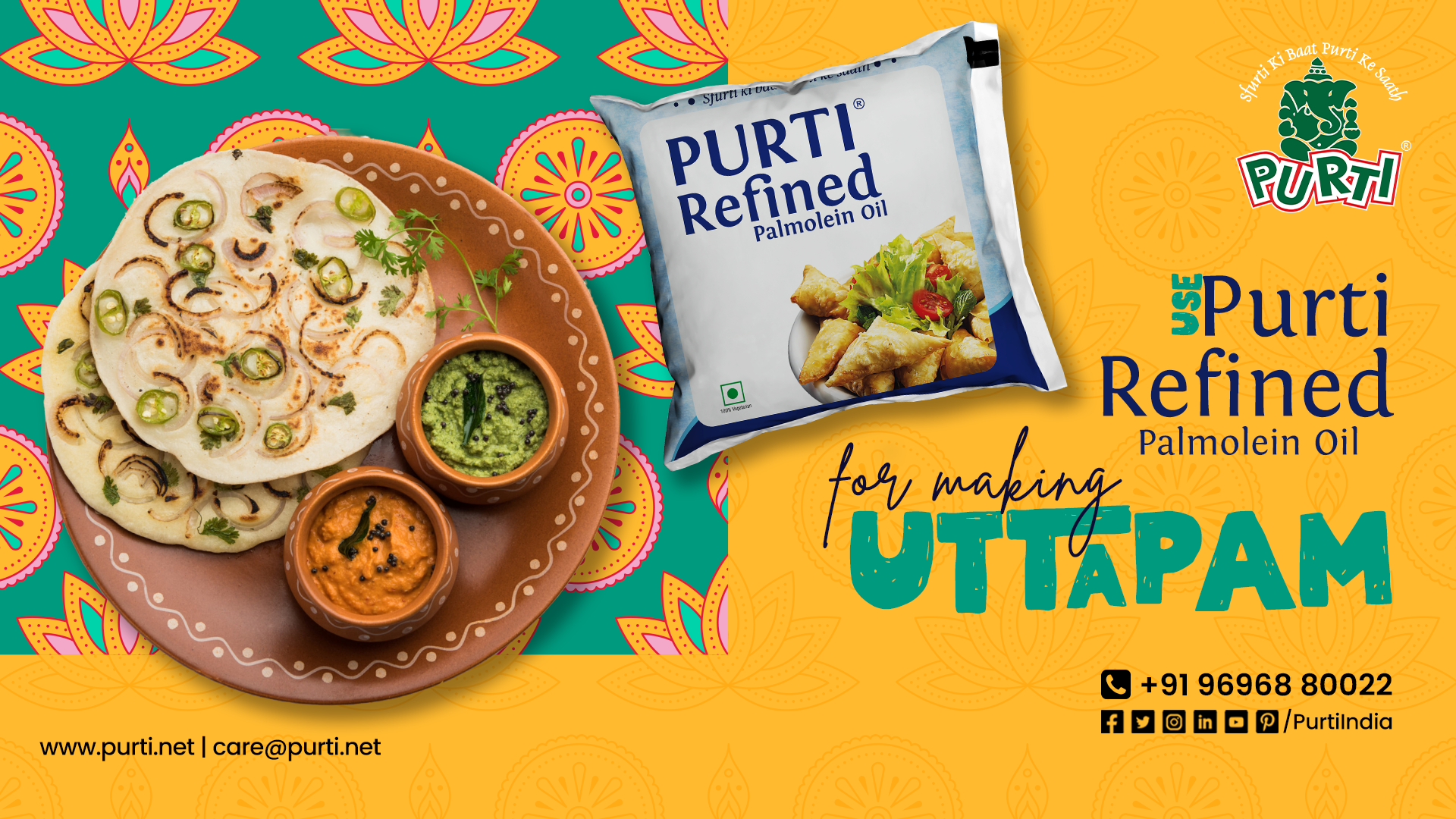 Enjoy the flavorful and wholesome Uttapam made with Purti Refined Palmolein Oil, adding a touch of goodness to your meal!