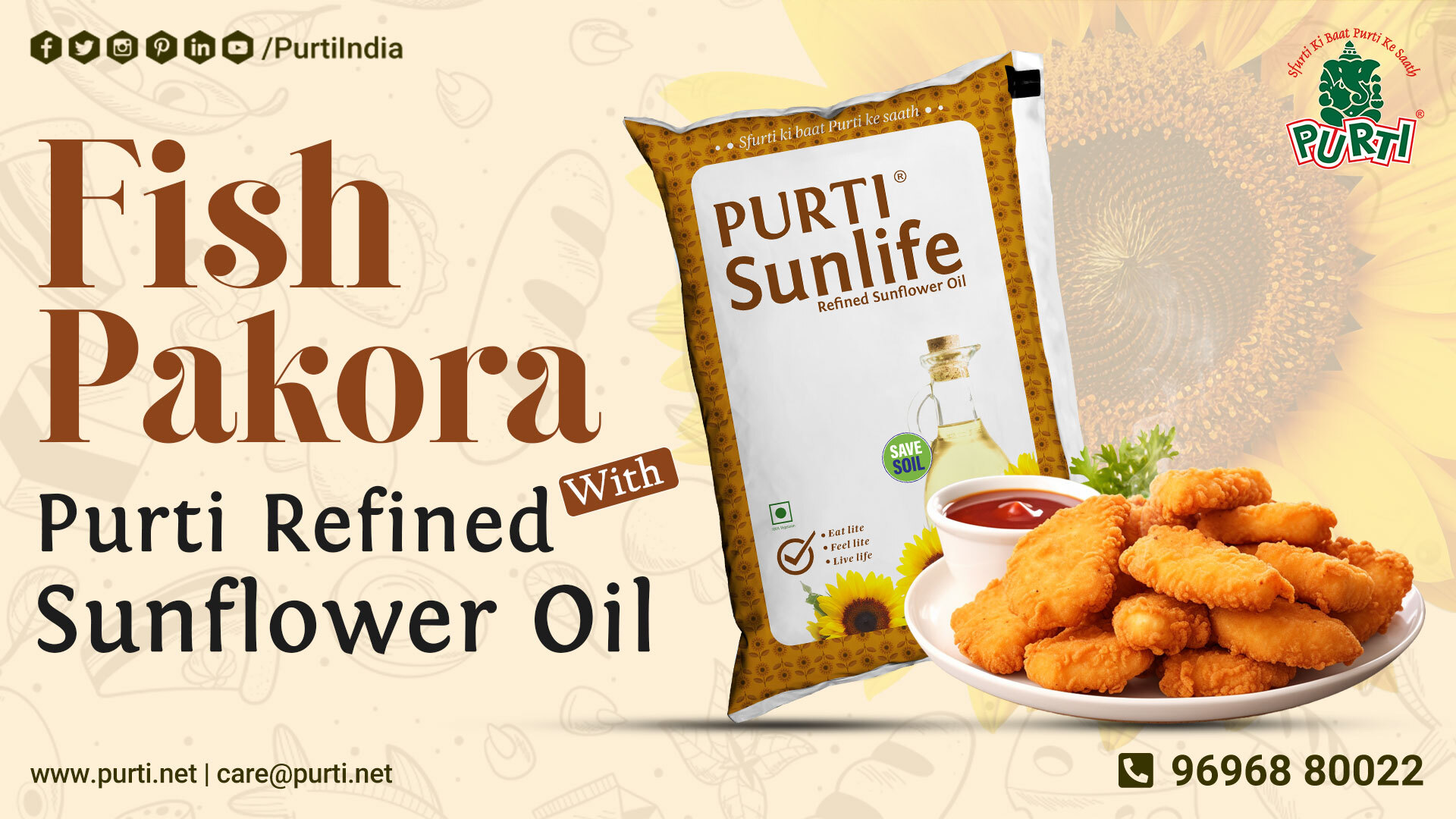 Step 4 : When the Purti Refined Sunflower Oil is hot enough, drop in a few pieces of battered fish. Do not overcrowd the pan, as the pakoras will stick together. Fry until golden and crisp, 2 to 3 minutes per side. Use a slotted spoon to turn over fish pieces.