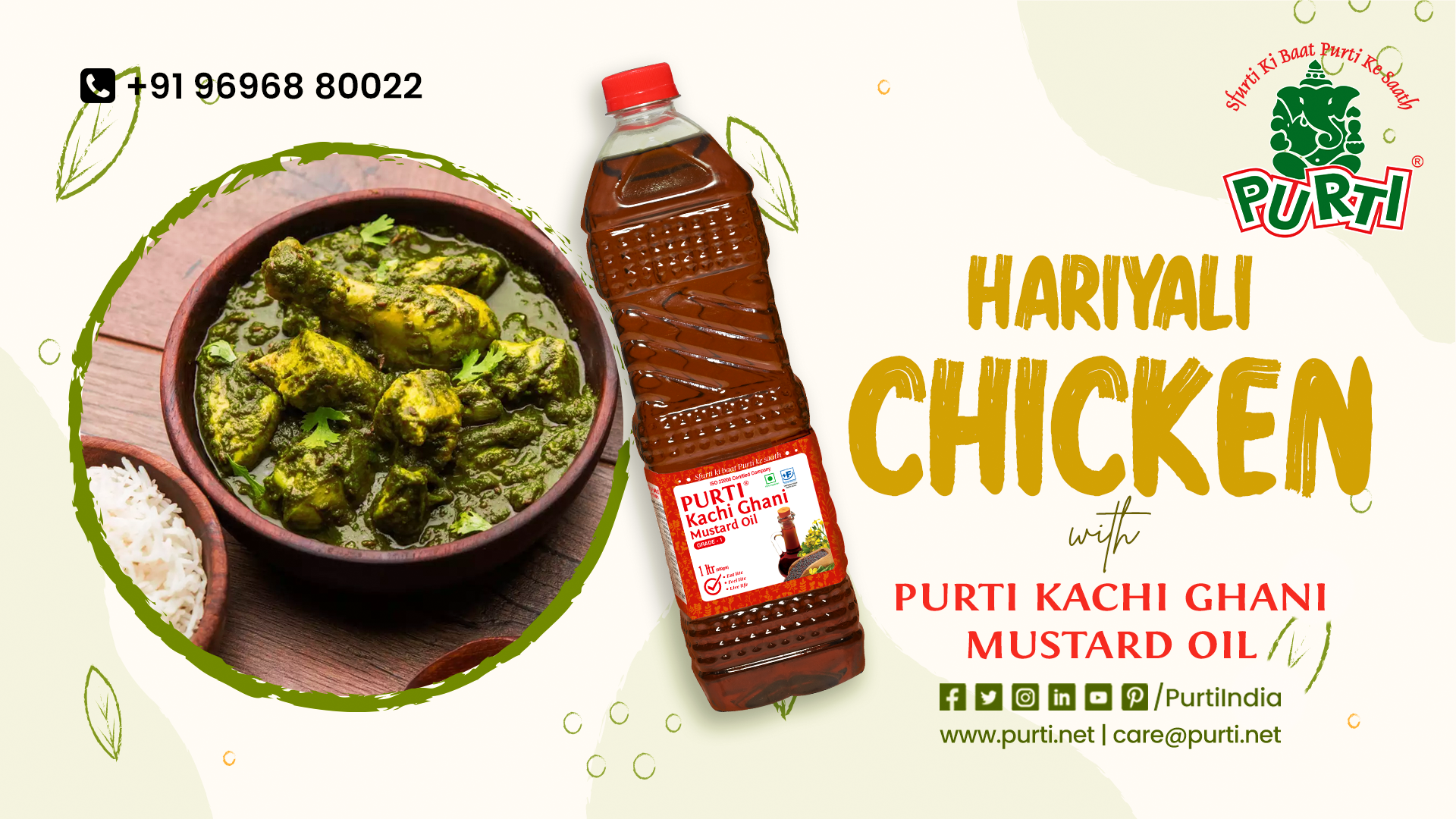 Enjoy your flavourful and nutritious Hariyali Chicken prepared with the richness of Purti Kachi Ghani Mustard Oil!