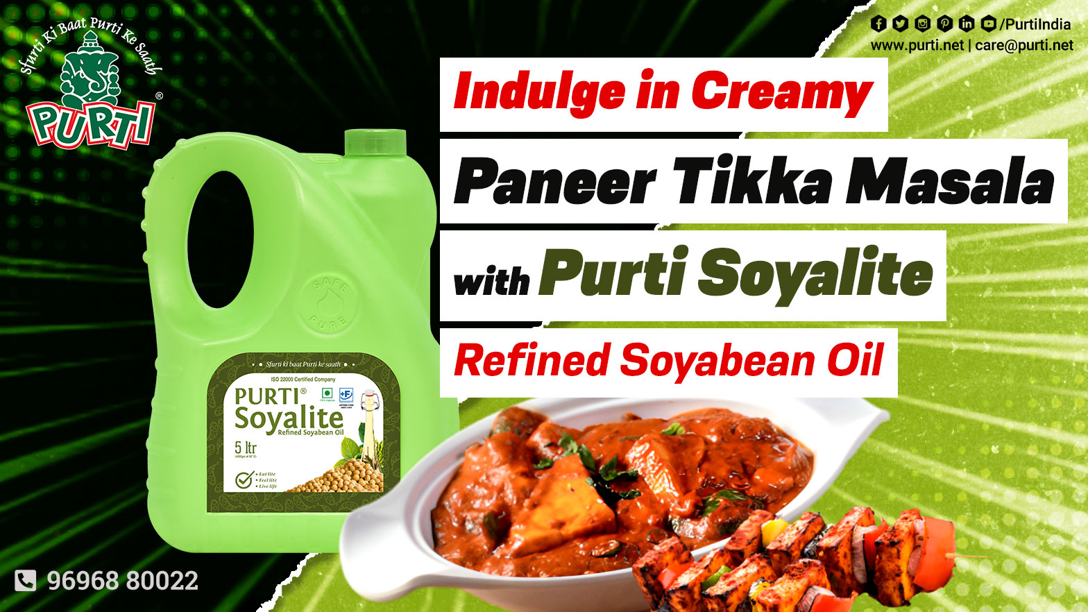 1) Begin by marinating the paneer. In a bowl, combine thick yogurt, ginger-garlic paste, red chili powder, turmeric powder, garam masala, salt, and 2 tablespoons of Purti Soyalite Refined Soybean Oil.