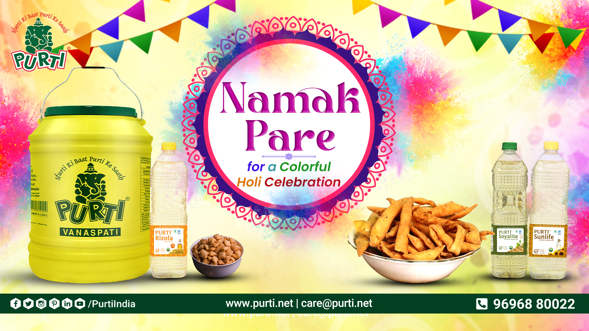 Purti Edible Oils are renowned for their purity and high performance in deep-frying, making them ideal for preparing Namak Pare. Their stable, high smoke point ensures that your snacks come out perfectly golden and crisp every time. The use of Purti Vanaspati not only preserves the authentic taste of traditional Indian recipes but also lets the natural flavors of the spices and herbs shine through. This ensures that every bite you enjoy is a true tribute to the cherished culinary heritage of Holi!