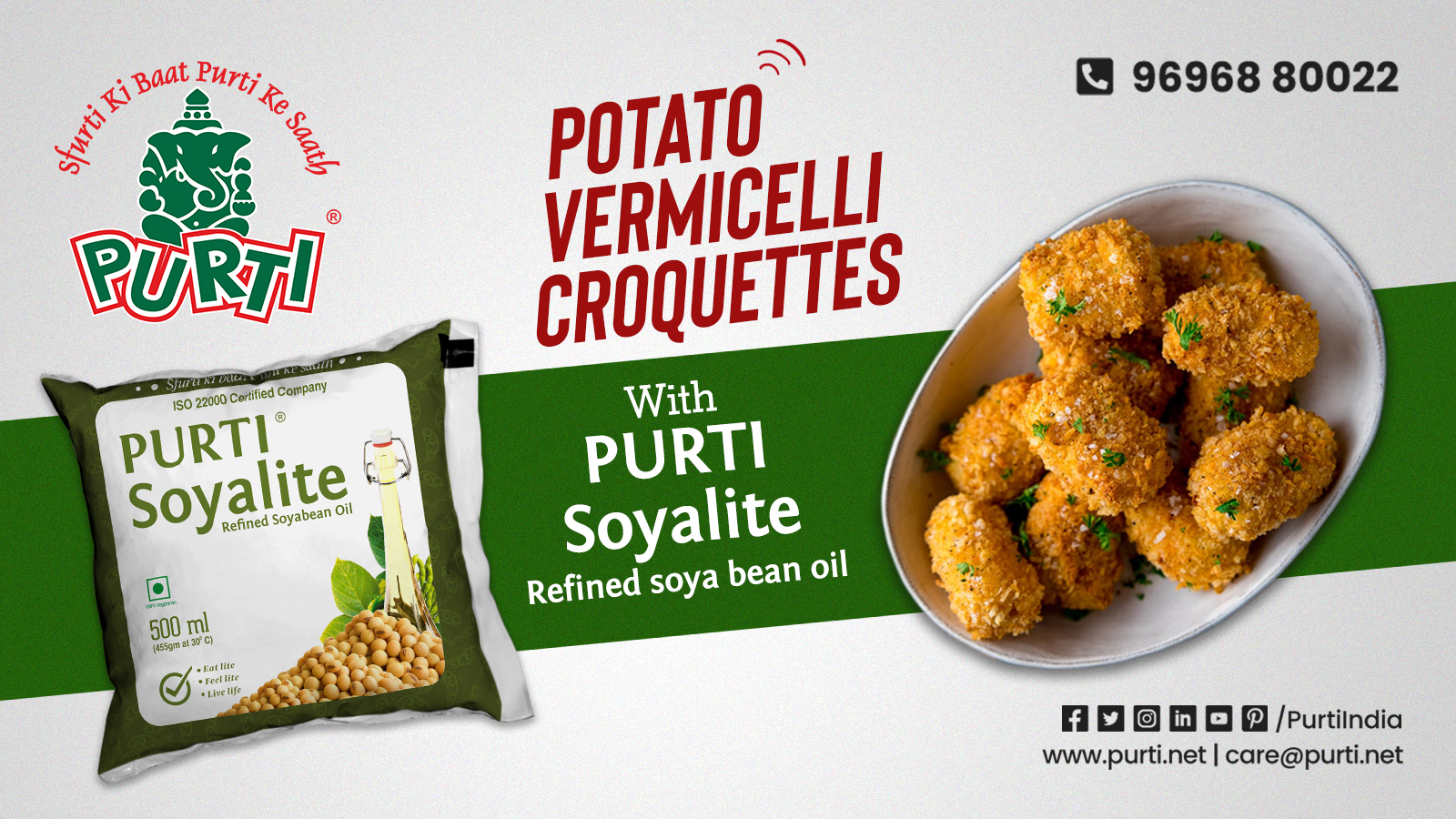 Finally, put a kadhai on medium flame and heat oil in it. When the Purti Soyalite oil is hot enough, dip the prepared potato croquettes in the flour paste gently and then dip in crushed vermicelli. Add these croquettes gently in the hot oil and deep fry until they are light brown in colour. Once done, repeat the process to make more such croquettes. Serve these crispy and hot paneer stuffed potato vermicelli croquettes with green chutney and enjoy.